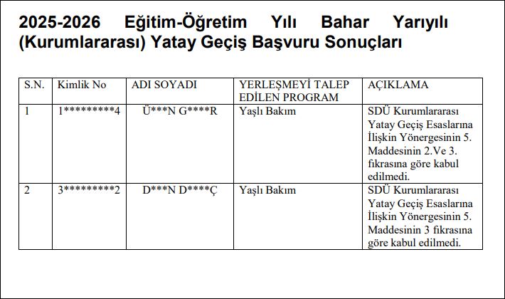 2025-2026 Eğitim-Öğretim Yılı Bahar Yarıyılı (Kurumlararası) Yatay Geçiş Başvuru Sonuçları Yayın Tarihi: 03/02/2026 Okunma Sayısı: 7